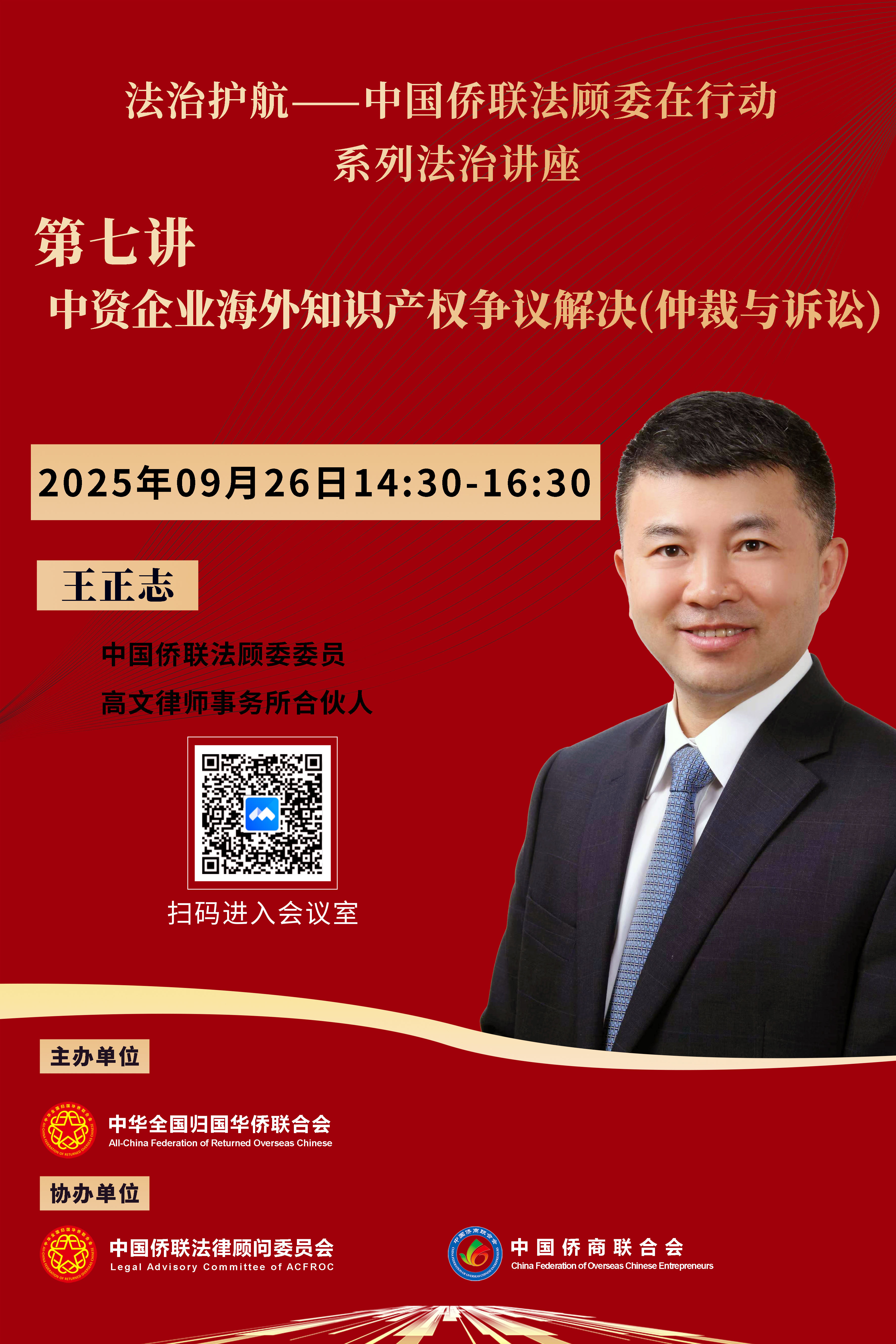 第七講將于9月26日(周五)14:30開(kāi)播,由中國(guó)僑聯(lián)法顧委國(guó)際貿(mào)易與仲裁專(zhuān)委會(huì)委員、高文律師事務(wù)所合伙人王正志律師主講,題目是《中資企業(yè)海外知識(shí)產(chǎn)權(quán)爭(zhēng)議解決(仲裁與訴訟)》。聽(tīng)課鏈接參見(jiàn)下方海報(bào)。